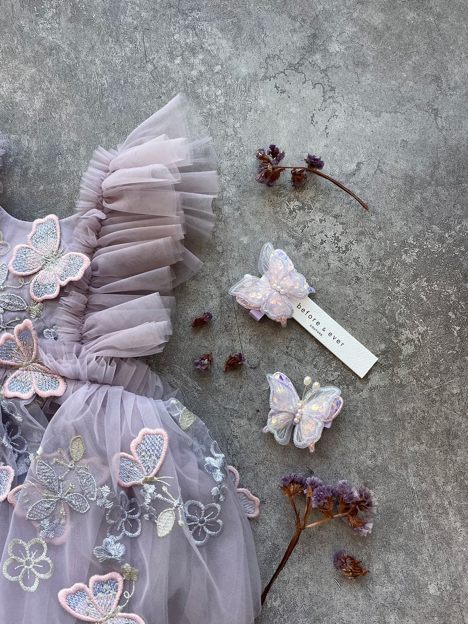 A set of two purple butterfly clips. Perfect match to our She's A Butterfly outfit!