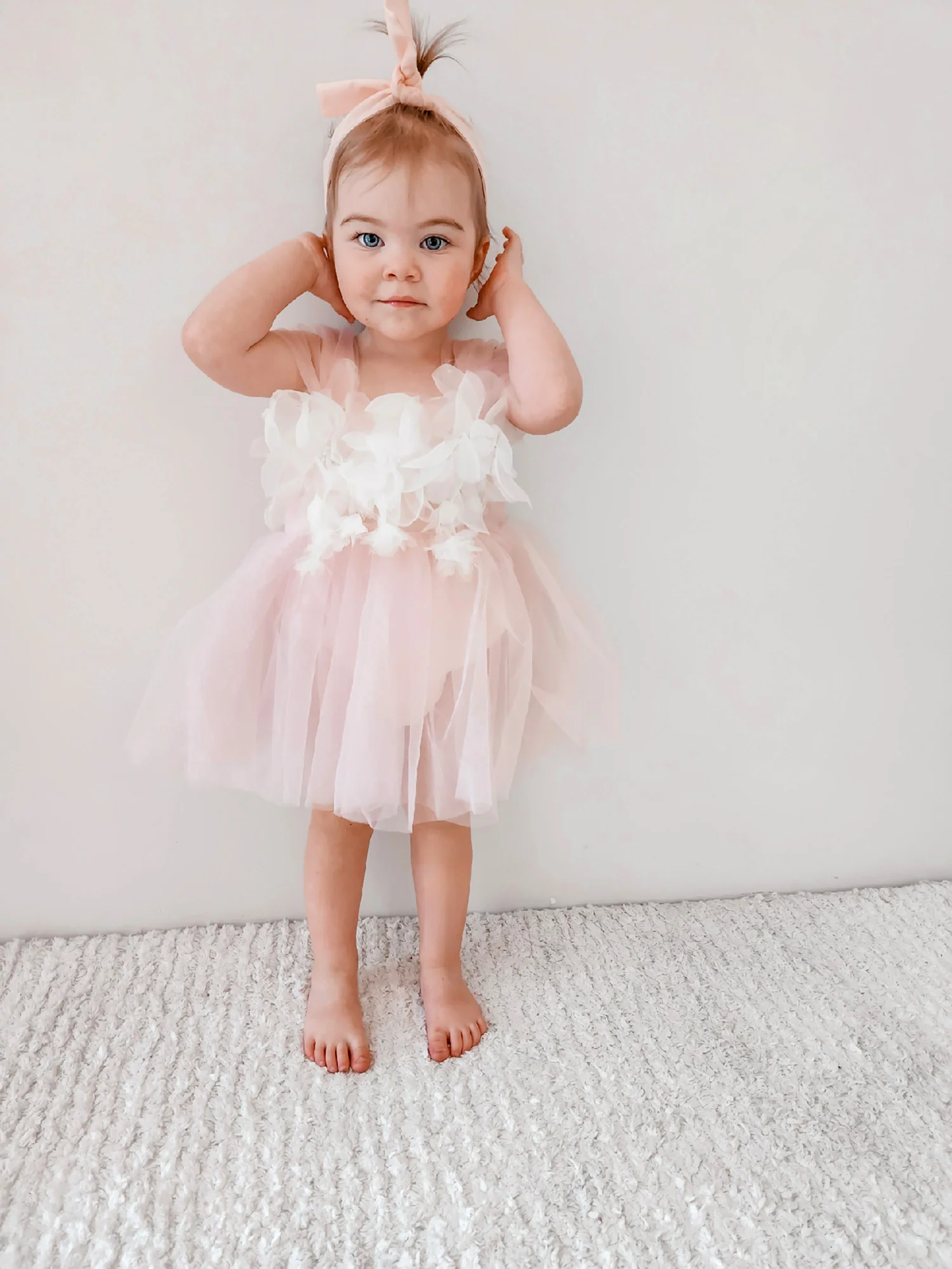 With a cascade of 3D flowers across the chest, each petal is a soft testimony to the joys of childhood and the splendor of nature. The pink tulle, airy and light, ripples with every giggle and step, creating a ballet of pastel hues that dance to the rhythm of little feet.