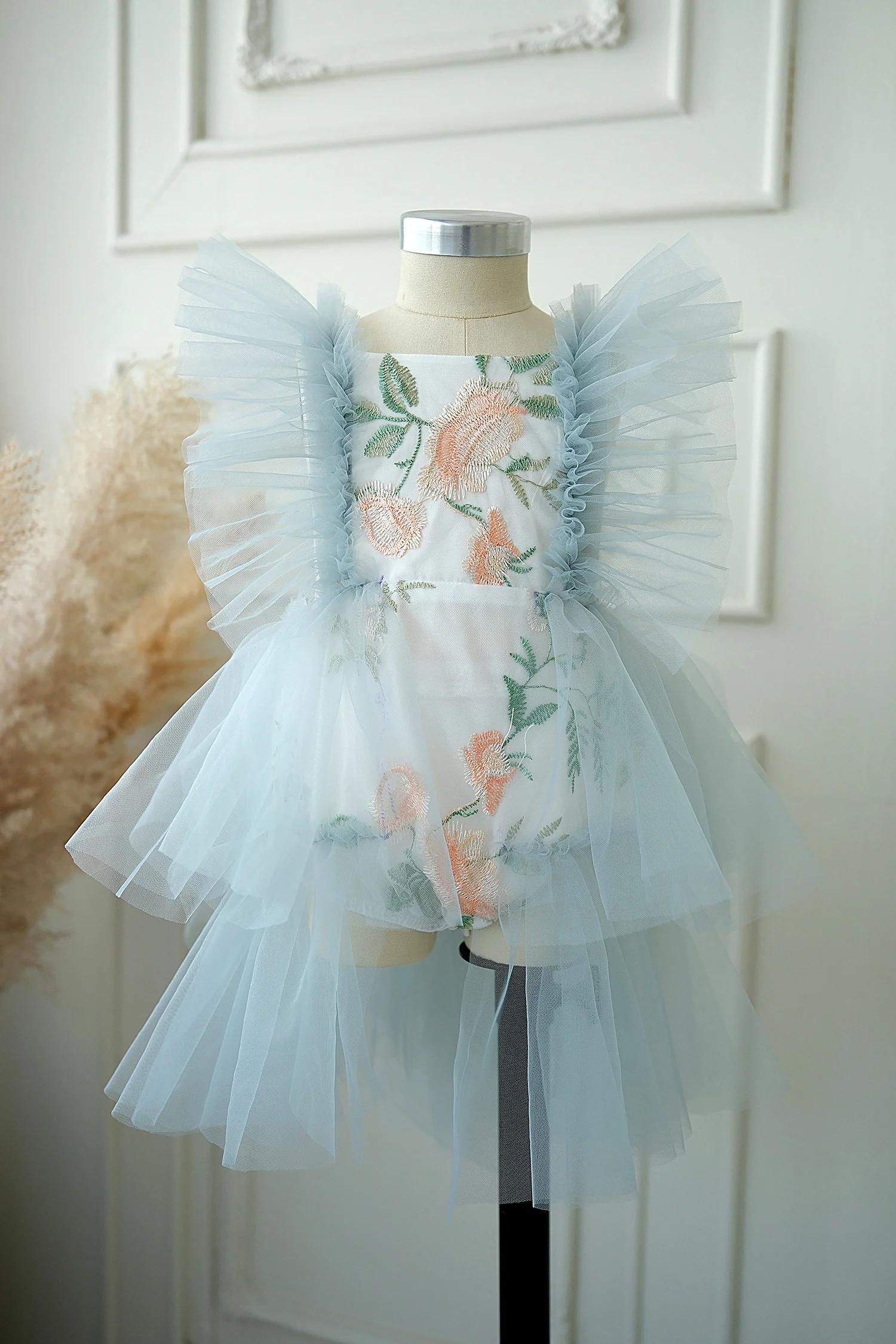 Crafted for little ones who look beyond the realm of pinks and purples, this romper is a celebration of the cool, calming spectrum of the ocean's palette. The exquisite embroidery depicts blooming roses that appear to float on waves, evoking a sense of romance and poetic grace that's as refreshing as a sea breeze.