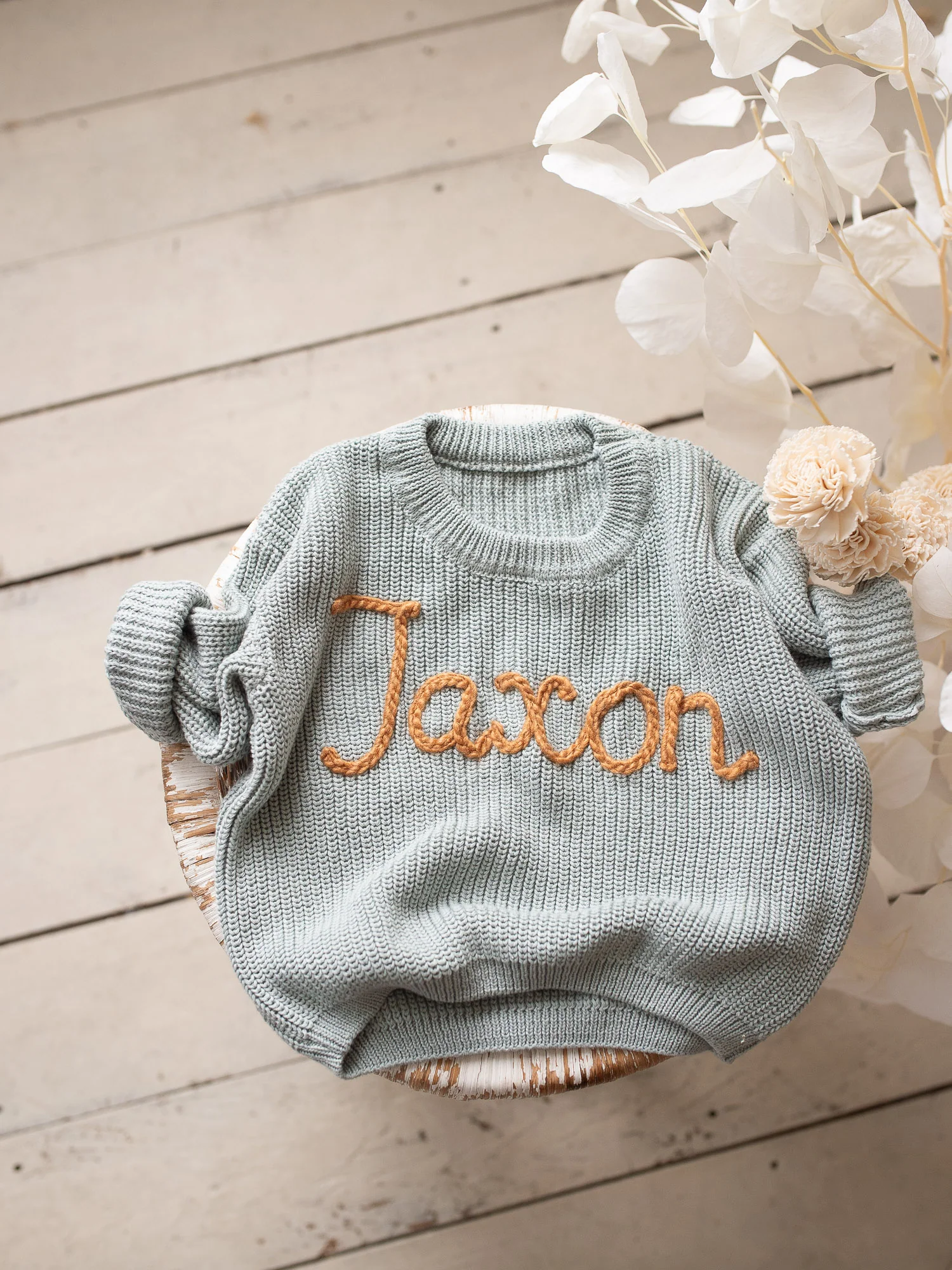 Stitched Just for Him: Embroidered with your little one’s name in chunky coloured yarn of your choice of colour.