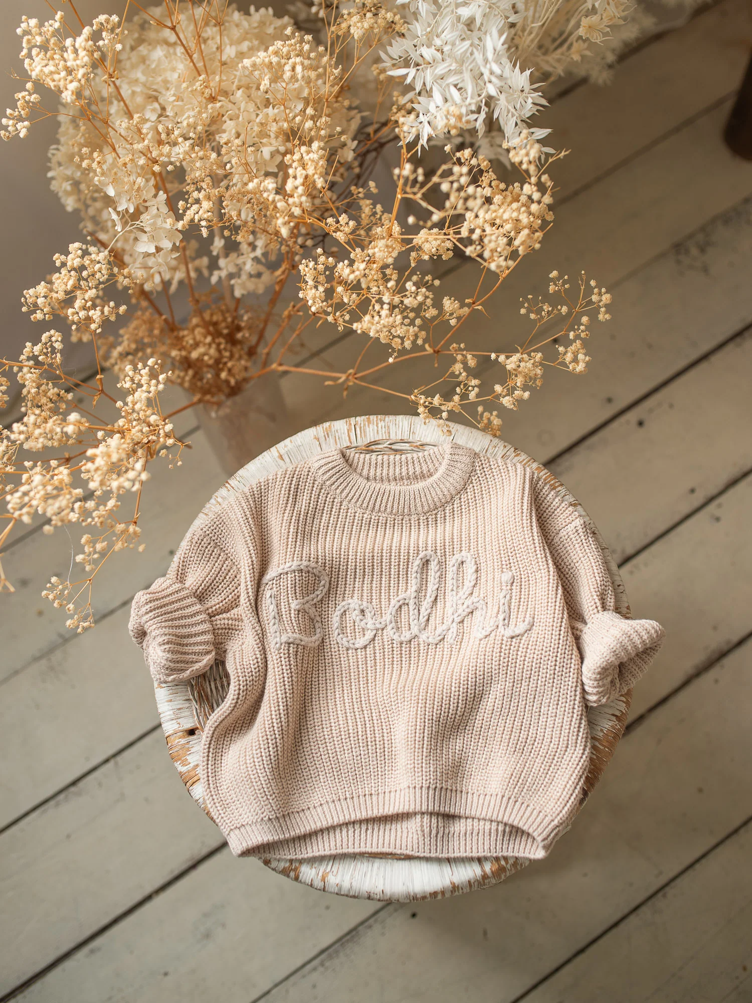 Stitched Just for Him: Embroidered with your little one’s name in beige chunky yarn.