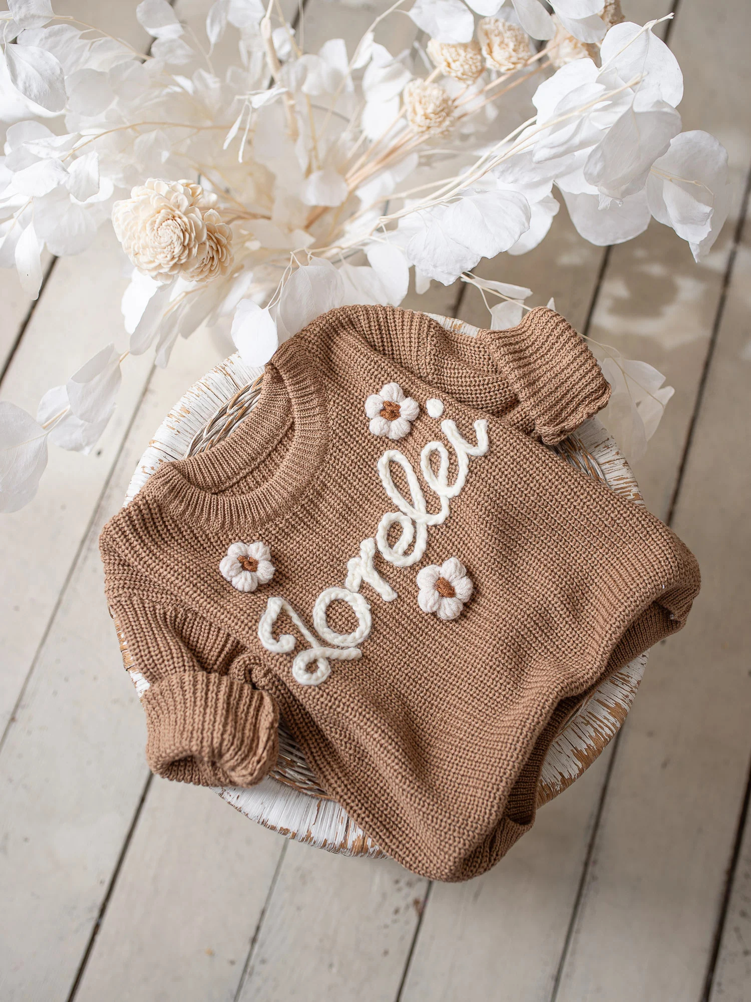 Blooming Details: Handmade touches from crocheted flower to name embroidery made just for you.